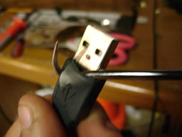 Siga adelante y tome el puerto USB de su macho. Vas a tener que cortar en el caso de caucho a metal sólido. Si es sólido, solo Levante lo aparte con cuidado. También puede cortar lejos en la goma que queda en la parte inferior para un mejor ajuste en los siguientes pasos. Etiquetado en la foto.