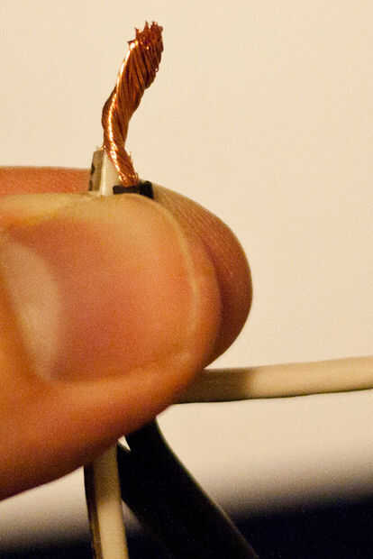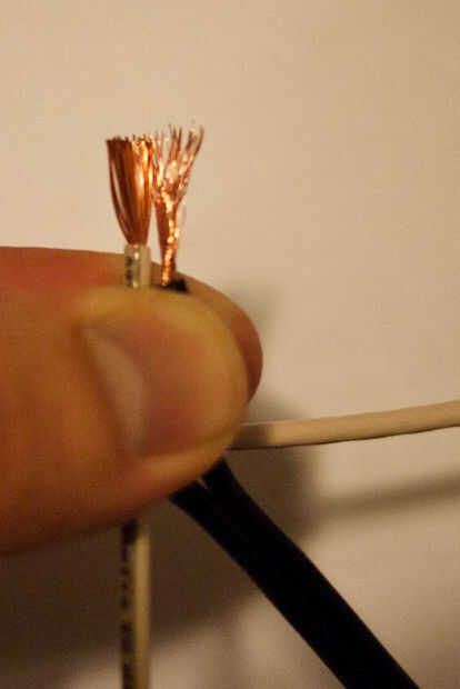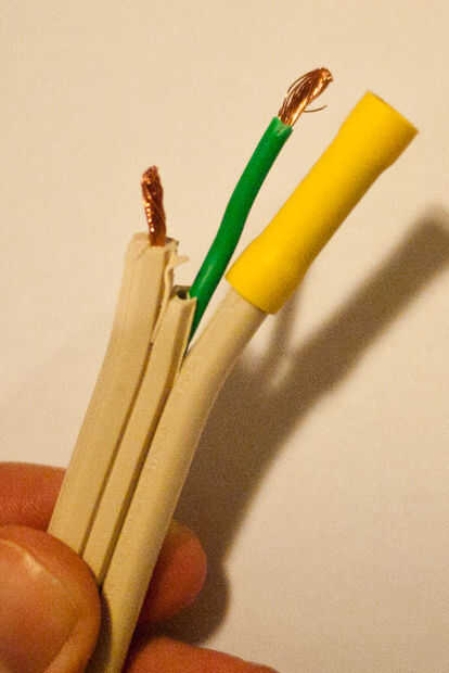 Ahora ataremos dos cables del relé y el cable de alimentación del PID para el cable de alimentación principal (final masculino). Con la herramienta que prensa, conecte un extremo de un conector de tope a un filamento del cable principal (no la tierra). Tire del conector para asegurarse de que no se aflojará. Combina un cable de relé y un filamento del cable de PID por aplanar las fibras de cobre con los dedos y girando en sí. Después el paquete combinado en el otro extremo del conector a tope y prensar bien.