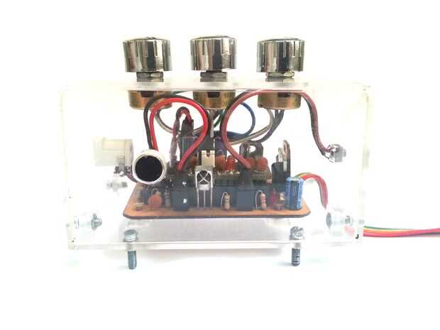 Coloque la placa a la base con tornillos. Fije los potenciómetros sobre el recinto, con las tuercas y añadir botones.