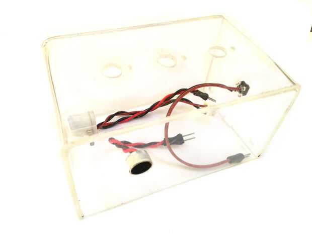 Un micrófono electret con cables soldados a un cabezal macho 2 pines se pega a un agujero perforado en el lado de la caja.