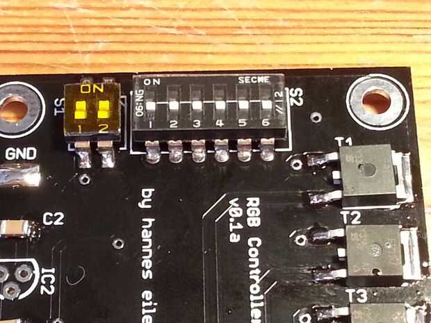 Ahora la soldadura de los interruptores dip. el interruptor de 2 polos smd en S1 y el interruptor de 6 polos en S2. Tenga cuidado, que la posición de encendido de los interruptores es el lado de la frontera de la pcb.