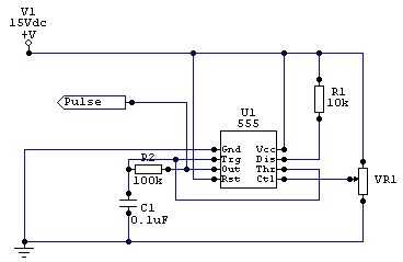 El circuito mostrado no sigue la práctica habitual, no puedo recordar donde llegué por primera vez a través de él, pero lo he usado por más de 10 años como un básico generador PWM y funciona, por lo que el crédito debe ir realmente a quien diseñó la versión original. Cuando se aplica 0V al pin 5 que un multímetro va a leer los pulsos como el equivalente de entre 5 y 8 voltios en la salida, pero un osciloscopio revela que en realidad es menor que '1 v' desde los pulsos son menos del 2% de la longitud de onda. Medida que se aumenta el voltaje en el pin 5 a Vcc la salida va hasta un 98% de potencia.