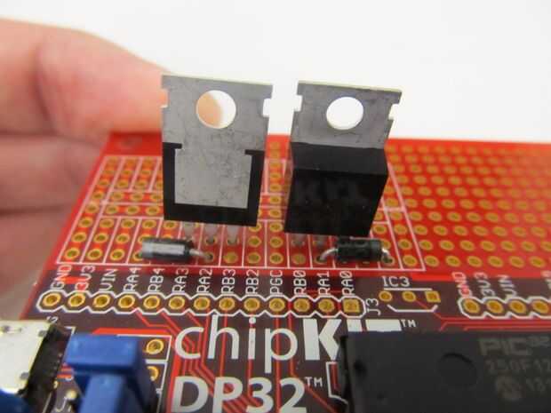 ¿Ver esa pequeña banda plateada en el borde exterior de ambos diodos? El diodo de la izquierda tiene su banda de la izquierda, mientras que el diodo de la derecha tiene su banda a la derecha. Esto es importante ya que los diodos son direccionales. Si pones al revés, el circuito no funcionará y te fríe sus transistores.