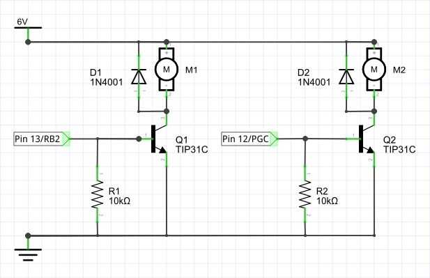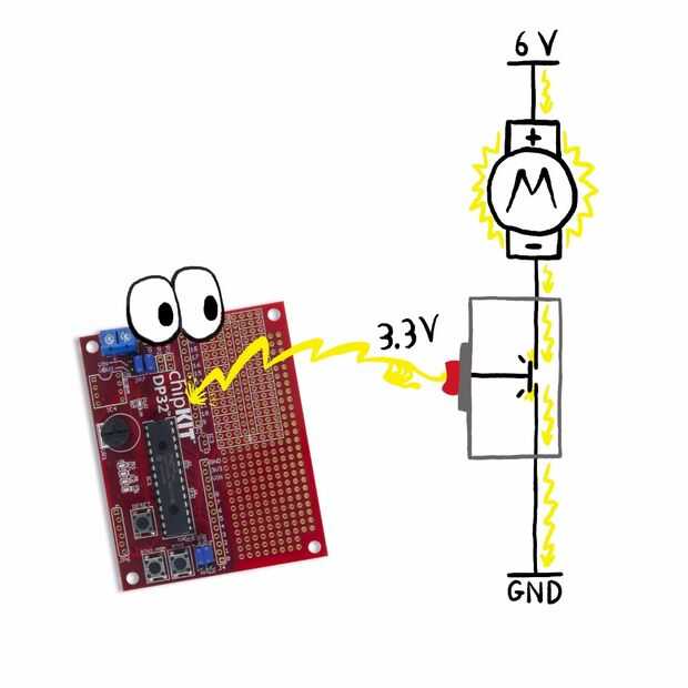 Esto da a los motores un montón de energía, pero para dar el control DP32, rompemos ese circuito con un transistor.