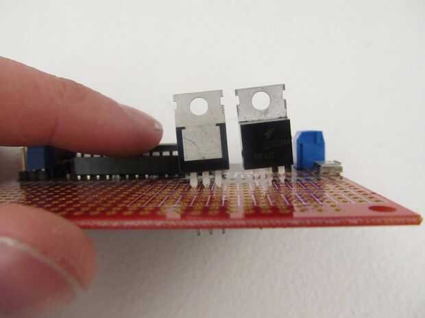 Si usted revisa la segunda foto, puedes ver que yo accidentalmente había soldado en torcido. Todavía funciona bien, pero agrava mi lado perfeccionista. Para evitar esto, recomiendo que usted soldarlos en su tablero uno a la vez. La primera punta de la soldadura y entonces la curva por lo que los otros dientes estén sentados correctamente. A mantenerlos en lugar mientras que soldarlos. Entonces el segundo transistor en la soldadura.