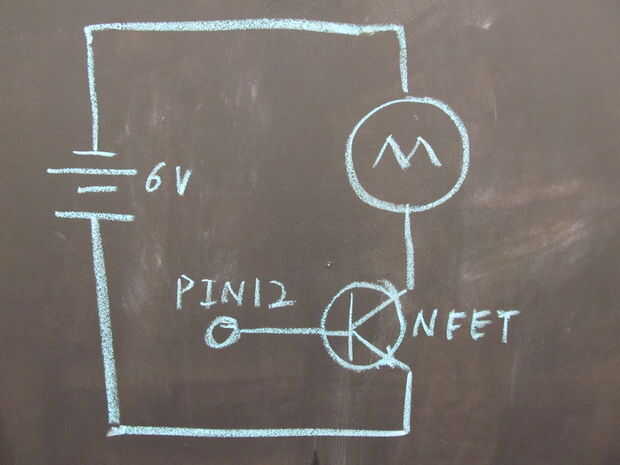 Lo que esto nos permite hacer es utilizar el N-FET como un interruptor electrónico, encendiendo y apagando nuestros motores. N-FETs son también muy rápido, por lo que si quisiera podría encender el motor y muy rápidamente, con eficacia dando menos potencia para hacerlo correr más lento! Lo que este circuito no nos permite hacer es cambiar la dirección que nuestro motor funcione. Para eso, necesita un circuito más complicado.