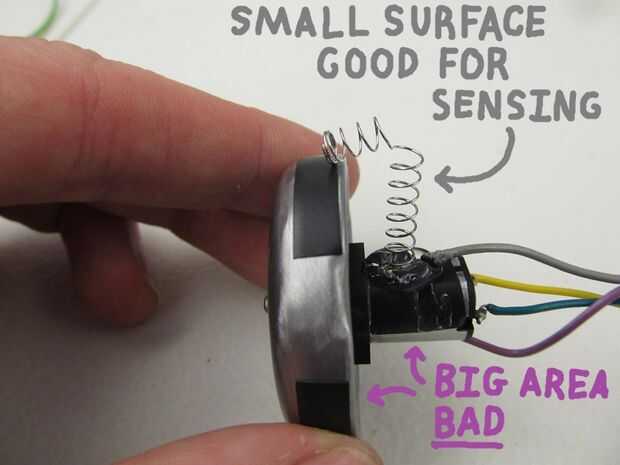 Revisa la foto de arriba. ¿Observe cómo la primavera tiene un área superficial muy pequeña en comparación con la rueda y la cubierta del motor? Porque la carcasa del motor, la rueda del metal y todo lo que tiene caja de cambios entre ellos, todos tienen una gran superficie, esto significa que pueden contener un montón de carga. Eso significa que no son tan buenos para usar como nuestro sensor real cuando llega el momento de conectarlo a la Junta.