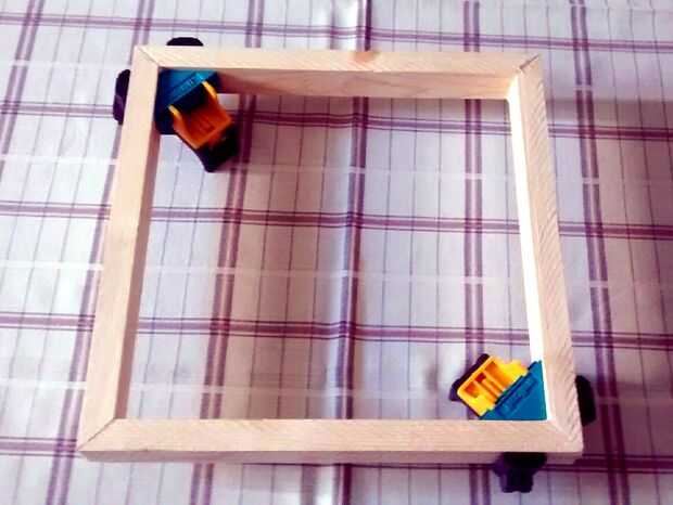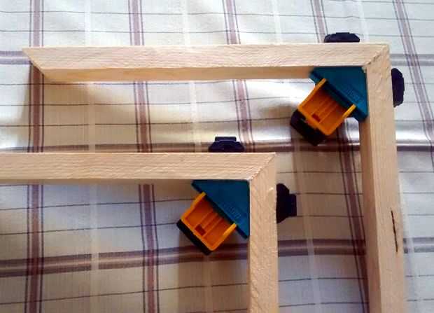 Encolamos las esquinas cortadas y las juntamos con las herramientas wolfcraft para ángulos. Como solo tenemos 2, pegamos 2 y 2 de tal manera cuando se seca (verano a partir de horas de las 2) podemos pegar las otras esquinas para obtener el marco completo. Esperar al menos 2 horas antes de quitar las herramientas wolfcraft.