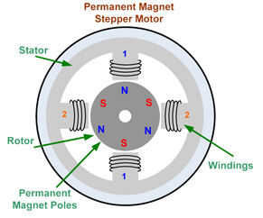 Un motor paso a paso consta de dos partes principales: un rotor y un estator. El rotor es la parte del motor que realmente gira y ofrece trabajo. El estator es la parte fija del motor que alberga el rotor. En un motor paso a paso, el rotor es un imán permanente. El estator consiste en varias bobinas que actúan como electroimanes cuando pasa una corriente eléctrica a través de ellos. La bobina electromagnética hará que el rotor alinear con él cuando está cargada. El rotor es impulsado por la alterna que la bobina tiene una corriente que lo atraviesa.