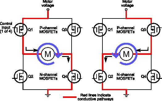 Un puente H es un circuito compuesto por 4 interruptores que pueden conducir con seguridad un motor de corriente continua o motor paso a paso. Estos interruptores pueden ser relés o (más comúnmente) los transistores. El transistor es un interruptor de estado sólido que puede ser cerrado enviando una pequeña corriente (señal) a uno de sus pines. A diferencia de un solo transistor que sólo le permite controlar la velocidad de un motor, puentes de H permiten también controlar la dirección en que gira el motor. Hace esto abriendo diferentes switches (transistores) para permitir que la corriente a fluir en diferentes direcciones y así cambiando la polaridad del motor. ADVERTENCIA: los interruptores 1 y 2 o 3 y 4 nunca deben estar cerrados juntos. Esto causará un corto circuito y daños al dispositivo.