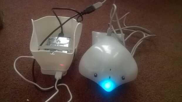Salir su Pinzón y su cable A B USB y conecte el extremo USB B en el Pinzón. Luego tome el extremo USB A y enchúfelo en el puerto USB en el adaptador. El adaptador tiene 2 cables usb, uno es energía y datos, el otro es solo poder, para asegurarse de que el cordón derecho va al puerto adecuado, desconecte la parte del adaptador que va en el Pi. Luces de Pinzón deben permanece encendido si apaga, entonces eso significa que el cable de datos esté conectado en la batería, si es el caso, luego cambie los cables del adaptador.