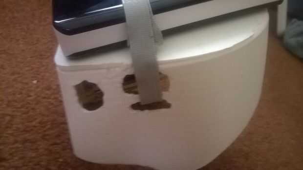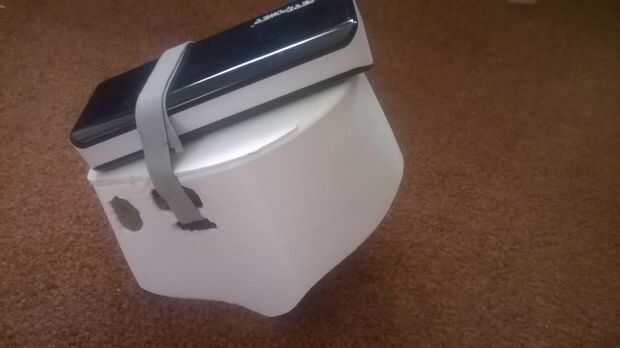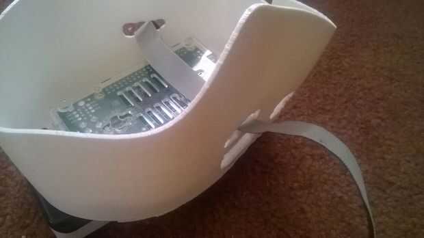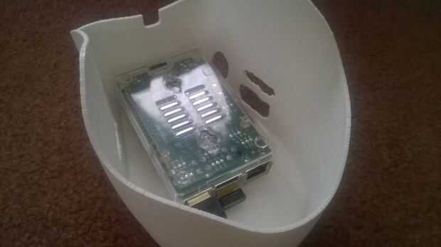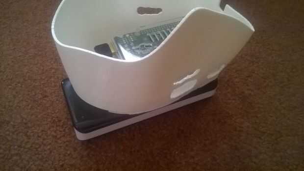 Necesitamos la frambuesa Pi, el Monte de Pinzón, la batería, y uno del Velcro correas ahora. Coloque Pi dentro de la montura con el micro puerto USB hacia el agujero para el poder. Luego poner la batería por debajo de la montura, para que el lado plano del Monte está en la cima de la pila, y el Pi es interior descansando sobre la parte plana. Siguen las fotos para mayor detalle. Luego nos pase una de las tiras de Velcro a través de los orificios más pequeños sobre la Pi. Mientras sostiene la correa apretada para que no caiga el Pi, el Monte boca abajo con la batería del tirón y asegure la correa sobre la batería. Asegúrese de que esté apretado, para que la batería no caerse o deslizarse demasiado.