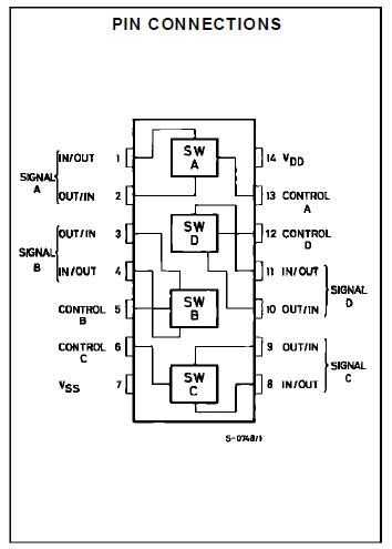 Podía haber utilizado relés, etc.. Mucho más simple es un gran circuito integrado que tiene incorporados interruptores analógicos (aislados), controlados por pines conectados a señales digitales. Se muestra el chip CMOS CD4066. Sólo necesitaba dos de sus interruptores para operar un ON y un OFF.