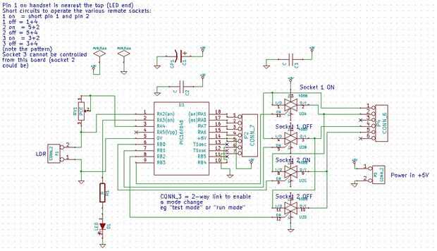 Aquí, el software es simple. Cada minuto, la LDR se comprueba. Si está por debajo de un umbral se opera el botón OFF en el auricular. Si está por encima del umbral, el botón funciona. Los botones se funcionan solamente si el nivel de luz ha cambiado a través del umbral - esto impide el botón ON (dicen) ser funcionado repetidamente cada minuto cuando el nivel de luz es alto.