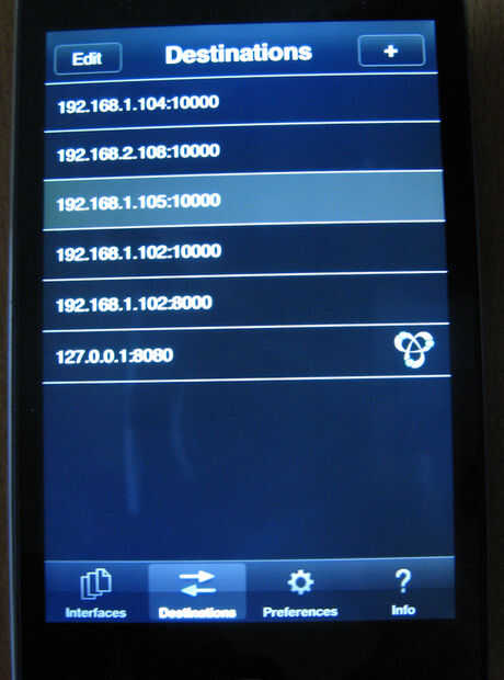 En tu iPod Touch, seleccione "Destinos" del menú. Pulse "+" e introduzca la IP del ordenador en la "Introducir URL de destino" (a la IP, no "http://"). Escriba 10000 como el número de puerto, luego pulse "Agregar". Su dirección IP y el puerto aparecerá en la lista. SELECT y se volverá gris.