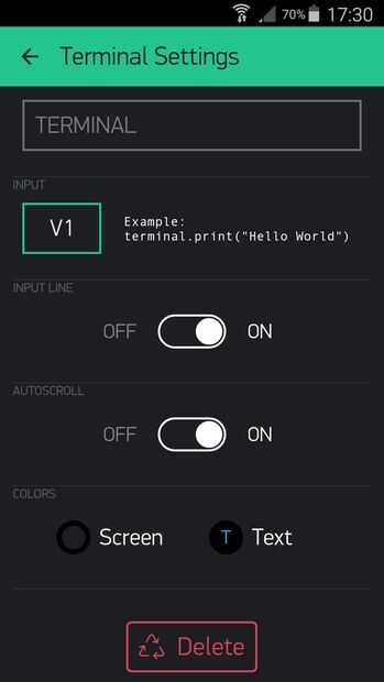 Añadir el widget de terminal. Blynk se ha convertido en un servicio de pago de una cierta cantidad de widgets, pero un montón de crédito gratis en señal de levantarse para hacer esta aplicación y dura para siempre. Elija v1 y establezca todas las opciones en "ON". (ver foto 4)