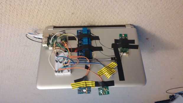 Otro problema que tuve fue que a pesar de me disparo con éxito el control remoto, la toma de corriente no iba y. El hecho de que podría ver la luz roja del mando a distancia, cuando se presionó el botón (casi) confirmado el problema era no con los relés, pero con el mando de sí mismo. Resultó ser una simple cuestión de qué orientación el mando a distancia se llevó a cabo en (o en este caso, pegar con cinta adhesiva, la tapa de mi Frankenputer). Cuando me mudé el aparejo entero a un pi independiente y colocar el remoto en un lugar más razonable, comenzó trabajando muy bien. Estoy bastante seguro que el problema está en los 'lóbulos' de antena de radio incorporada el control remoto.