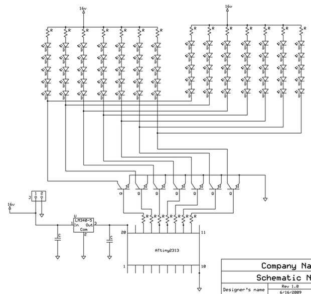 Para determinar el tamaño de la resistencia, primero Averigüe cuánto voltaje se cae por led. Azul y verde de que he usado, la caída de voltaje es alrededor de 3 a 3,3 voltios. Rojo y amarillo son de led alrededor de 2,2 voltios.