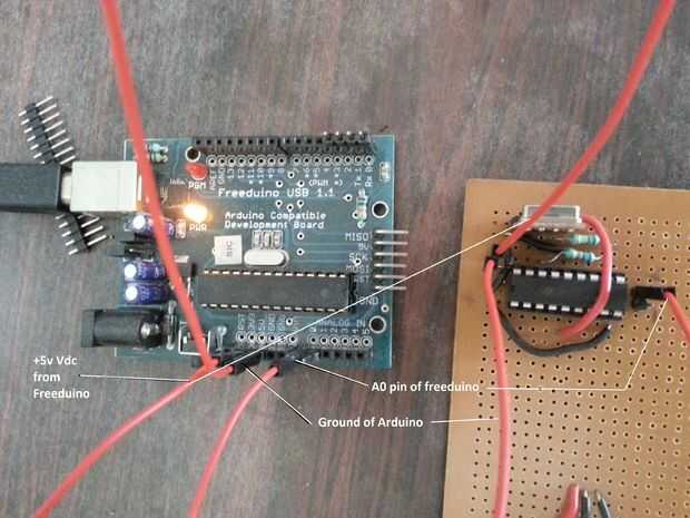 El poder de este circuito de transmisor es proporcionado por la salida de 5v constante desde el Freeduino.