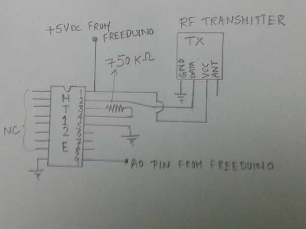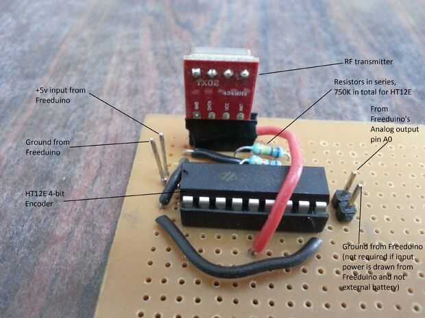 Señal del transmisor es dada por un codificador de 4 bits - HT12E que está conectada al pin de salida de señal analógica de Freeduino, A0.