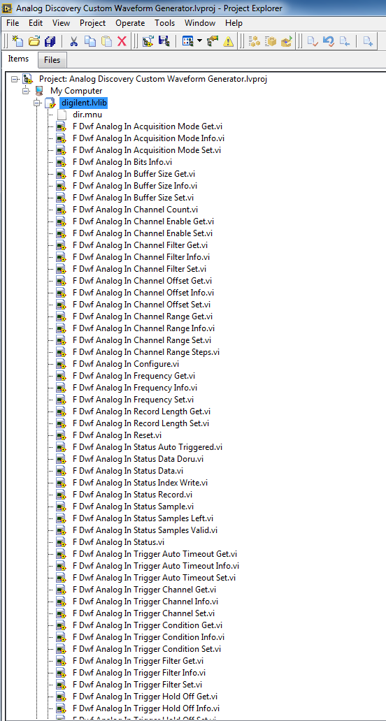 en la ventana de proyecto. Cada VI en esta lista tiene una correspondiente función de C y C++ API. Para obtener más información acerca de cómo funciona cada función consulte el Manual de referencia de formas de onda, como se muestra en la imagen de arriba.