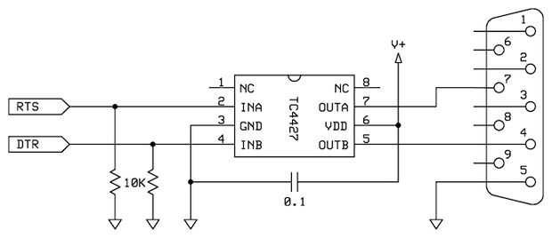 La x10 petardo no es realmente un dispositivo de "comunicación en serie" como un módem, sino más bien acepta datos desde el microcontrolador por secuencias del pedacito de la lectura de las líneas DTR/RTS. La hélice puede fácilmente enviar datos sobre estas líneas con un nivel de TC4427-palanca de cambios.