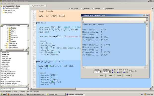 Una vez que hayas hecho esto utilizar F10 para enviar a ellos a su propulsor y cargar el Terminal Serial Parallax (empaquetado con hélice herramienta.) Programa de prueba de Jon utiliza comandos mecanografiados como a1on, a2on, a1off, a_bright y así sucesivamente. Programa de prueba de ron es un poco más interactivo, que contiene tanto una demostración automatizada, así como capacidad de mando paso a paso.