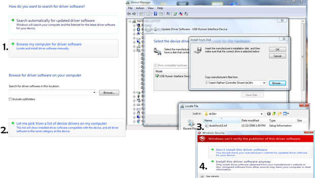 A continuación, haga clic me deja elegir de una lista de controladores de dispositivo en mi ordenador y haga clic en "tener disco...". Encontrar la ubicación de la carpeta ds3drv y haga clic en dualshock3.inf. (Imagen 4)