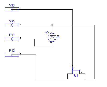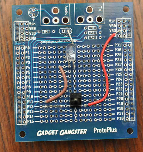 Estoy utilizando el símbolo incorrecto para un receptor de infrarrojos, pero es el dispositivo en el U1. Esperemos que no se ve demasiado complicado - usted apenas enganchar el cable largo del LED a P12, la pata corta a la tierra. Conectar el primer pin del receptor IR (el pin de la izquierda cuando la cúpula es hacia arriba) a P12, el perno medio tierra y el pin 3 al V33. Aquí el circuito es sobre un ProtoPlus.