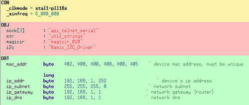 Lo IP del servidor Web debe configurarse. Primero, descargue la herramienta de la hélice (Windows, Mac, Linux), luego abrir Top_object.spin. Hacia el principio, verás que es la configuración IP;