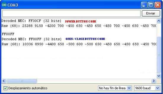 Después de haber construido el circuito y cargarlo en nuestro arduino, abra el monitor de serie arduino, apunte el control remoto hacia el receptor infrarojo y presione la tecla de la cual se quiera capturar el código. Debe visualizarse el el monitor serial el protocólo, código y matriz de tiempos de la tecla presionada.