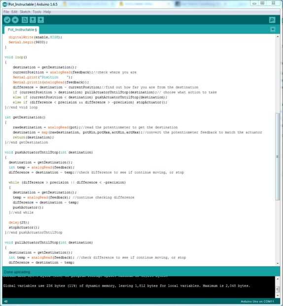 La idea detrás del programa es tomar una lectura del potenciómetro (u otro sensor análogo), tomar una lectura de la posición de los actuadores y compararlos. Si son diferentes, extensión/retracción del actuador para emparejarlos. Utilizaremos la función map(), para simplificar la comparación.