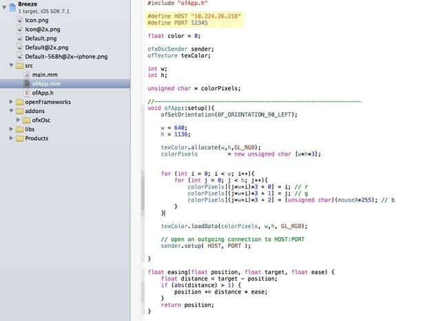 Una vez que su dirección IP, copiar la carpeta llamada oscSenderExample dentro de la carpeta of_v0.8.1_ios_release/examples/ios a la carpeta myApps dentro de of_v0.8.1_ios_release/apps. Abra el archivo de proyecto de Xcode llamado "oscSenderExample.xcodeproj" dentro de la carpeta copiada. Una vez abierto, ver el navegador de proyecto de la izquierda y haz clic en el archivo llamado "ofApp.h". Donde dice #define HOST "localhost", cambio de local host a su dirección IP. Ahora Desplácese hasta el archivo llamado "ofApp.m".