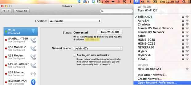Ahora llegamos a las cosas buenas. Antes de hacer cualquier codificación, asegúrese de que tu wifi funcionando sin problemas con ningún cortafuegos y obtener su dirección IP. Puede hacer esto haciendo clic en el icono de wifi en barra de herramientas del Mac y haga clic en preferencias de red abierta. Su dirección IP es el número que se destacó y borrosa hacia fuera en la imagen arriba, sin el período final.