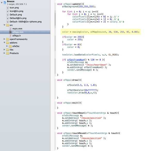 Aquí, he creado un fondo degradado que cambia de color dependiendo de la posición Y del dedo al tocar la pantalla. El código para esto y la función de aceleración que se encarga de la transición, están en las imágenes de arriba. Es implementado por el "texColor.loadData (colorPixels, w, h, GL_RGB)" la función. El ejemplo está configurado para pasar a la posición X e Y del dedo través de OSC para el ejemplo de proyecto de recibir a través de esta llamada de función, "sender.sendMessage (m);". Eso es todo para el envío, ahora nos podemos comenzar a trabajar en la recepción.