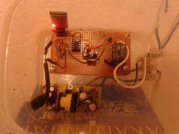 Hice un falso y barato $7 teléfono android controlador via bluetouth. Nivel de dificultad: 3/10. Programé un chip attiny comunicarse con el módulo de bluetioth mediante software serial y controlar las luces con un relé de 5v. Para la alimentación tengo un cargador de teléfono antiguo.