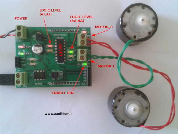 Los niveles de la lógica en 1A, 2A y 3A, 4A pins se pueden visualizar fácilmente mirando el LED A1, A2 y B1, B2 cerca el chip L293D.
