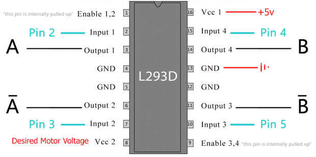 La mayoría de motores paso a paso atrae a gran cantidad de corriente que el arduino no puede manejar, por lo que estoy usando el L293D controlador de motor de dc [controlada por Arduino] para proveer el motor con la corriente suficiente. Si usted elige otro controlador de motor DC, consulte su hoja de datos para conocer su cableado correcto y si usted debe atar con alambre flyback diodos o no.