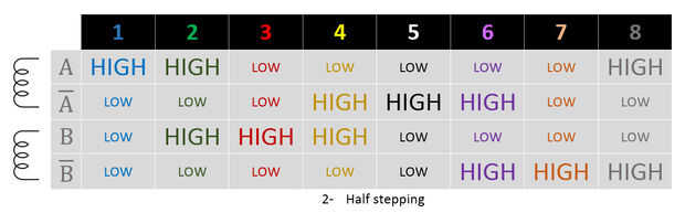 # Modo medio paso a paso, que te da más pasos por revolución, pero ofrece menos par de torsión.