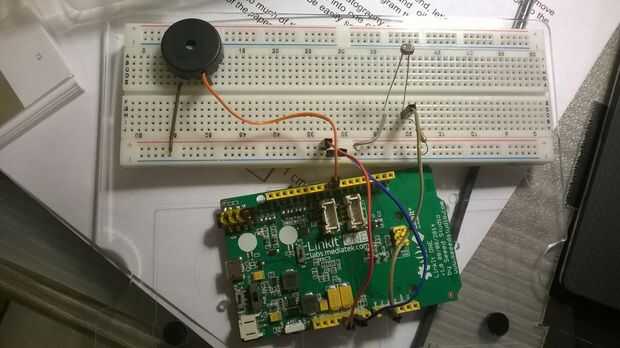 Finalmente, conecte el piezo a LinkIt uno por los cables principales para pin digital 8 en LinkIt uno y el carril de tierra de la placa.