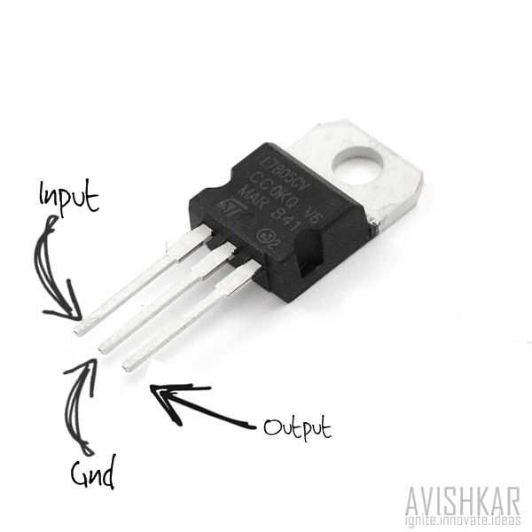 • Tomar lo positivo de la fuente de la batería y conecte la entrada del IC 7805 y también conectar su negativo a GND del 7805 y conseguirá fuente de 5V de la clavija de salida 3. Para verificar el flujo de energía, conectar un LED a la salida de pin a través de un resistor de 1K
