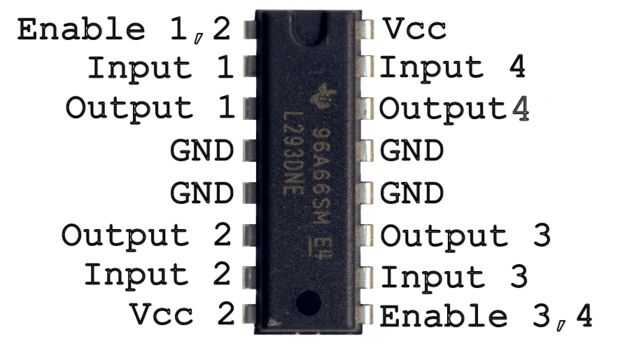 1. Proporcionar la fuente de 5v a los pines 1, 9 y 16 del L293D.