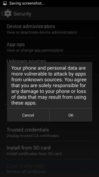 - Desplácese a configuración/seguridad y desplácese hacia abajo. Debería ver un cuadro que dice fuentes desconocidas y una cajita a su lado. Pulse sobre la casilla y activar. Abrirá un cuadro de diálogo diciéndote cómo esto es el riesgo; ¿suena buen derecho? Así pulse el botón OK. Ver fotos 1, 2 y 3.