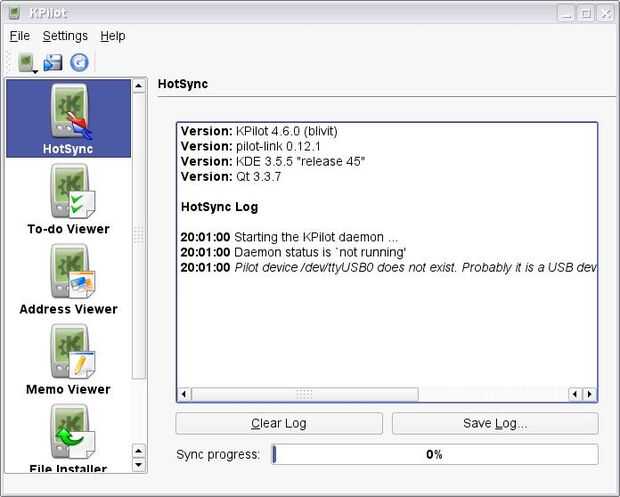 Si el uso de Linux y KDE chances son que KPilot ya está instalado en su sistema. Por lo menos en mi ordenador que se encuentra debajo de la utilidad -> Sincronización -> KPilot en el menú de aplicaciones. La primera vez que arranque abrirá a un asistente que le guiará a través de la configuración. Una vez que se inicia se puede ir a "Archivo instalador" para agregar archivos que serán instalados en la Palm Pilot próxima vez que sincronice. Si su uso de Gnome, o KPilot ya no está instalado, usted debe ser capaz de usar su gestor de paquetes para instalar. GNOME tiene su propio software para organizadores de sincronización llamado gnome-pilot pero no estoy familiarizado con él de mí.