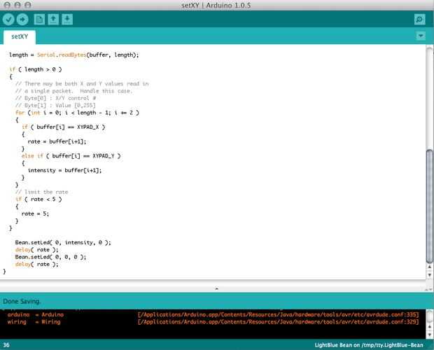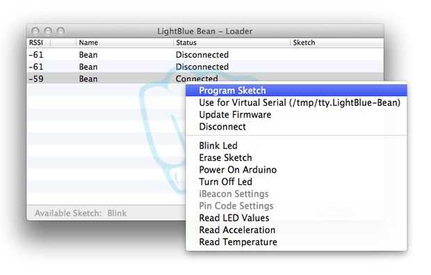 /* XY Blink This sketch is intended to be used with the LightBlue Sandbox screen, particularly the X-Y trackpad screen. NOTE: This sketch is not a low-power sketch. This example code is in the public domain. */ void setup() { Serial.begin(57600); Serial.setTimeout(5); } #define XYPAD_X 8 #define XYPAD_Y 9 static uint8_t rate; static uint8_t intensity; void loop() { char buffer[64]; size_t length = 64; length = Serial.readBytes(buffer, length); if ( length > 0 ) { // There may be both X and Y values read in // a single packet. Handle this case. // Byte[0] : X/Y control # // Byte[1] : Value [0,255] for (int i = 0; i < length - 1; i += 2 ) { if ( buffer[i] == XYPAD_X ) { rate = buffer[i+1]; } else if ( buffer[i] == XYPAD_Y ) { intensity = buffer[i+1]; } } // limit the rate if ( rate < 5 ) { rate = 5; } } Bean.setLed( 0, intensity, 0 ); delay( rate ); Bean.setLed( 0, 0, 0 ); delay( rate ); } Abra la aplicación del cargador de la haba y conectará su frijol. Asegúrese de actualizar el firmware, si lo que dice.