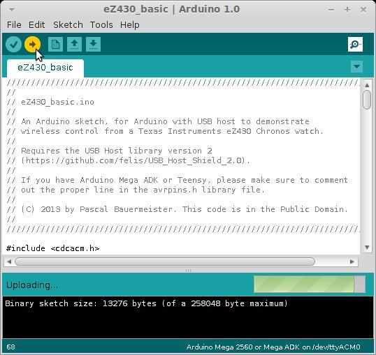 Crear un sketch de Arduino desde el archivo eZ430_basic.zip adjunto en este paso. Compilar, cargar y ejecutar.