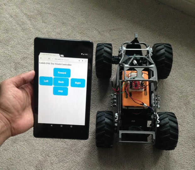 Ahora carga AA baterías en la parte inferior de la camioneta y uso de la tableta/teléfono control de su camión de juguete.
