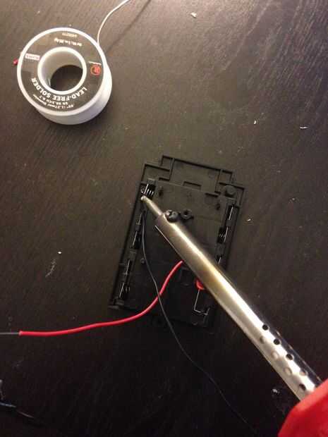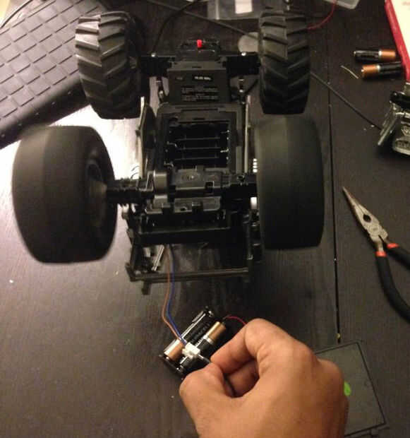 Soldar algún cable de diseño a los dos extremos del soporte de la batería como se muestra en la foto de arriba.