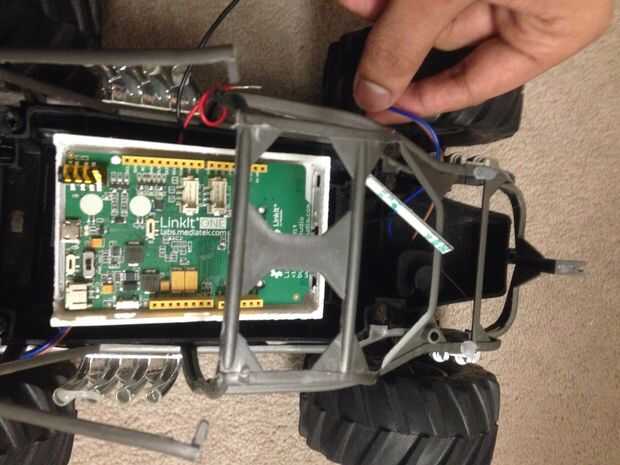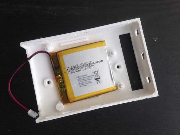 Añadir la batería lipo que viene como parte del paquete uno de LinkIt el 3D impreso parte como se muestra en la imagen de la linea superior.