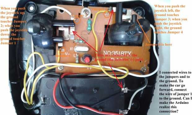 Después de abrir el transmisor, tienes que comprobar primero lo que "estimula" un comando dado. Para mi transmisor, he encontrado conectores que "tocan" cuatro puentes para pasar cuatro comandos: adelante, atrás, izquierda y derecha. Puente 1 (J1) es para el comando hacia atrás, puente 2 (J2) es comando adelante, puente 3 (J3) es para la izquierda y puente 4 (J4) es para los comandos de derecha.